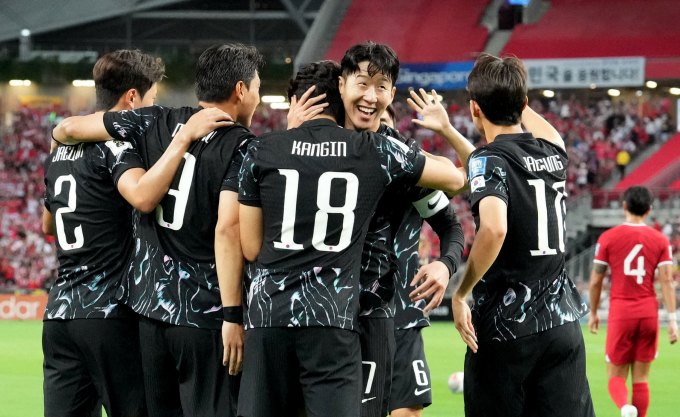 김도훈 임시감독이 이끄는 대한민국 축구 국가대표팀이 싱가포르에서 시원한 승리를 거두고 2026 월드컵(캐나다·멕시코·미국 공동 개최) 아시아 3차예선 진출을 확정지었다. 사진은 지난 6일(현지시각) 싱가포르와의 2026 북중미 월드컵 2차 예선 5차전 원정 경기에서 골을 터뜨린 손흥민. /사진=로이터