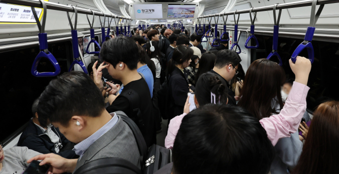 서울 지하철의 41%가 소음 80㏈을 넘어 실내 최고 소음 수준을 넘어서는 것으로 나타났다. 사진은 서울 지하철 4호선이 출근하는 시민들로 가득찬 모습. /사진=뉴스1
