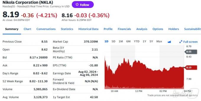 28일(현지시간) 뉴욕증시에서 니콜라는 전거래일보다 4.21% 급락한 8.19달러를 기록했다. 니콜라는 전일에도 14% 가까이 폭락했었다.