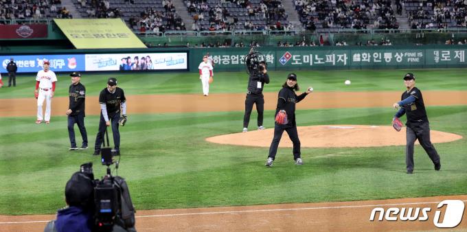 김기태 KT 퓨처스팀 감독, 구대성 전 질롱 코리아 감독, 정민태 전 한화 코치, 이상훈 MBC 스포츠플러스 해설위원이 7일 오후 인천시 미추홀구 SSG 랜더스필드에서 열린 프로야구 '2022 신한은행 SOL KBO 포스트시즌' 한국시리즈 5차전 키움 히어로즈와 SSG 랜더스의 경기에서 시구하고 있다. 2022.11.7/뉴스1 ⓒ News1 박지혜 기자