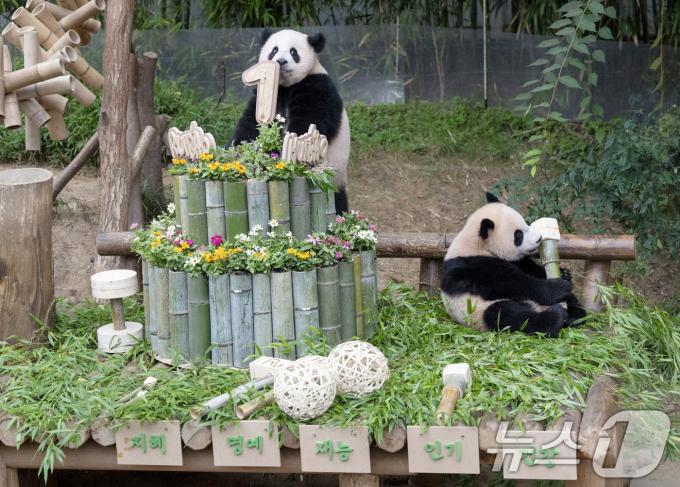 돌잔치의 하이라이트는 판다들의 돌잡이였다. 쌍둥이 판다의 건강과 행복한 판생을 바라며 대나무로 만든 붓, 판사봉, 공, 마이크, 아령이 준비됐다. 이날 루이바오는 아령을, 후이바오는 마이크를 잡았다. (에버랜드 제공) 2024.7.7/뉴스1