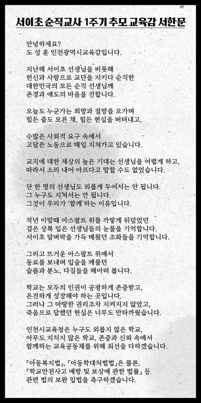 서이초 순직교사 1주기를 맞아 도성훈 교육감이 일선 학교에 발송한 서한문./사진제공=인천시교육청