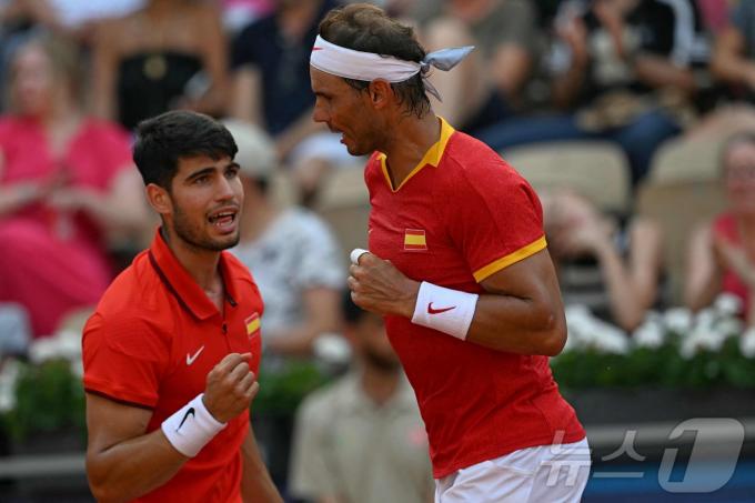 (서울=뉴스1) 김도용 기자 = 스페인 테니스의 '신구 황제' 라파엘 나달(38)과 카를로스 알카라스(23)가 2024 파리 올림픽 테니스 남자 복식 8강에 진출했다.