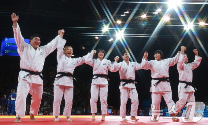 (파리(프랑스)=뉴스1) 박정호 기자 = 대한민국 유도대표팀 이준환, 김하윤, 김민종, 허미미, 안바울, 김지수 선수가 4일(한국시간) 프랑스 파리 샹 드 마르스 아레나에서 열린 2024 파리올림픽 유도 혼성 단체 동메달 결정전 독일과의 경기에서 동메달을 확정지은 후 기뻐하고 있다. 2024.8.4/뉴스1