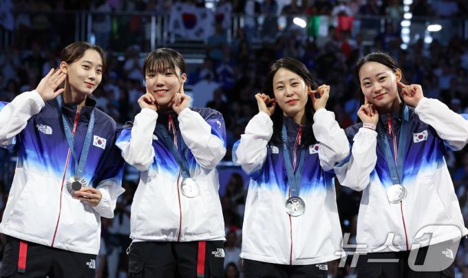 대한민국 펜싱 대표팀 윤지수, 전하영, 최세빈, 전은혜 선수가 4일(한국시간) 프랑스 파리 그랑 팔레에서 열린 2024 파리올림픽 여자 사브르 단체 시상식에서 . 2024.8.4/뉴스1 ⓒ News1 이동해 기자