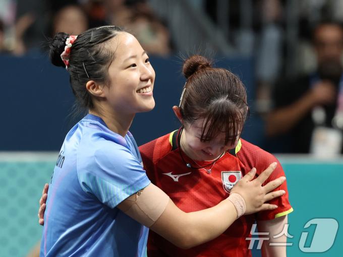 대한민국 탁구 대표팀 신유빈이 3일(한국시간) 프랑스 파리 사우스 파리 아레나 4에서 열린 '2024 파리올림픽' 탁구 여자 단식 동메달 결정전 일본 히나 하야타와의 경기에서 패배한 후 상대 선수와 인사하고 있다. 2024.8.3/뉴스1 ⓒ News1 이동해 기자