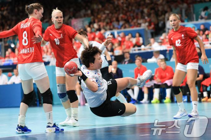 4일(한국시간) 프랑스 파리 사우스 파리 아레나6에서 열린 2024 파리올림픽 핸드볼 여자 예선 라운드 A조 대한민국과 덴마크의 경기에서 강은혜가 슛을 하고 있다. 2024.8.4/뉴스1 ⓒ News1 박정호 기자