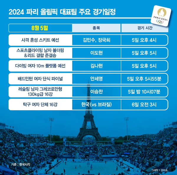 2024 파리올림픽에 참가하고 있는 한국 선수단이 6일(한국시각)에도 다양한 종목에서 경기를 치를 예정이다. /그래픽=강지호 기자