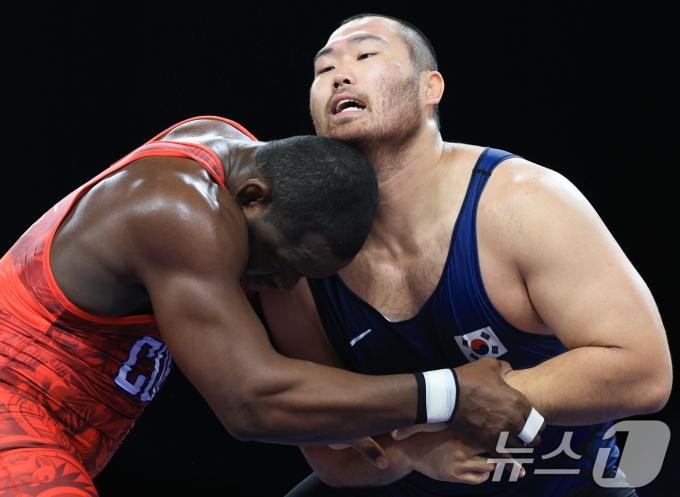 (파리(프랑스)=뉴스1) 박정호 기자 = 대한민국 레슬링 국가대표 이승찬 선수가 5일 오후(한국시간) 프랑스 파리 샹 드 마르스 아레나에서 진행된 레슬링 남자 그레코로만형 130kg급 16강 경기에서 쿠바의 미하인 로페즈 선수와 자웅을 겨루고 있다. 2024.8.5/뉴스1