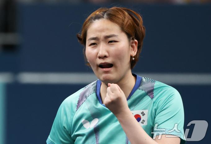 (파리(프랑스)=뉴스1) 박정호 기자 = 대한민국 탁구 대표팀 이은혜 선수가 6일 오전(한국시간) 프랑스 파리 사우스 파리 아레나 4에서 열린 '2024 파리올림픽' 탁구 여자 단체 16강 브라질의 브루나 다카하시 선수와의 경기에서 득점한 후 기뻐하고 있다. 2024.8.6/뉴스1