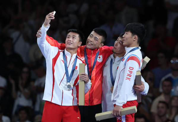 정부가 북한 측이 수령한 삼성 스마트폰에 대해 대북제재 위반 소지 가능성이 있다고 밝혔다. 사진은 북한의 리세웅(오른쪽)이 6일(현지시각) 프랑스 파리 샹드마르스 경기장에서 열린 2024 파리올림픽 레슬링 남자 그레코로만형 60㎏급에서 동메달을 목에 걸고 시상대에 올라 다른 메달리스트들과 셀카를 찍는 모습으로 기사 내용과 무관함. /사진=로이터