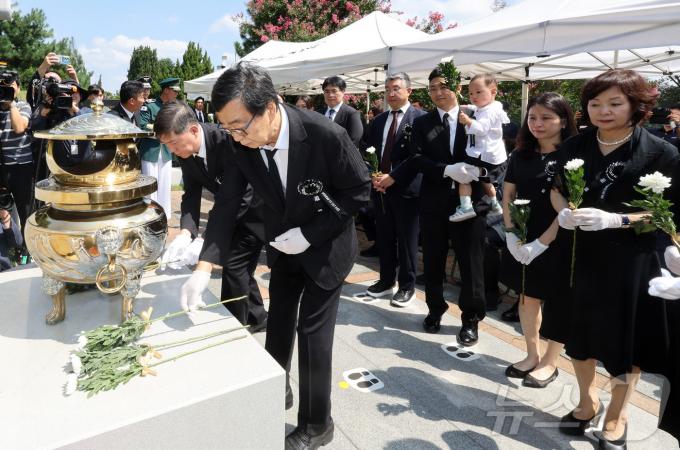 (서울=뉴스1) 김도우 기자 = 김홍업 이사장과 유가족이 18일 서울 동작구 국립서울현충원 김대중 전 대통령 묘역에서 헌화를 하고 있다. (공동취재) 2024.8.18/뉴스1