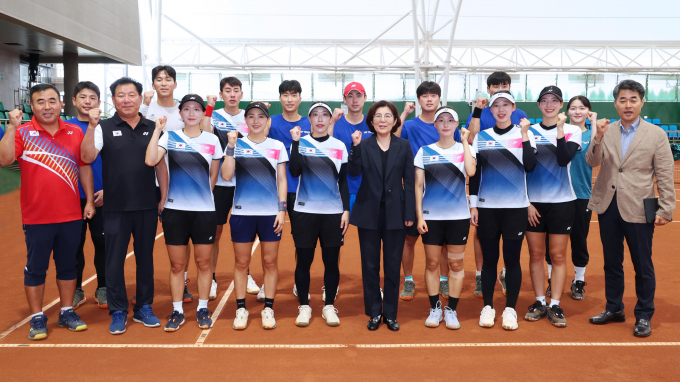 김보라 안성시장이 안성맞춤소프트테니스구장을 찾아 소프트테니스 국가대표 선수들을 만나 응원의 말을 전했다 / 사진제공=안성시