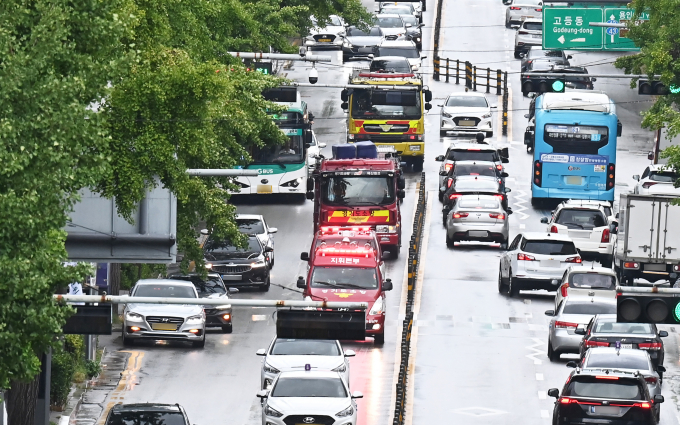전남 구례군 광의면 주택에 화재가 일어나 주택 안에 있던 90대 남성과 80대 여성 노부부가 숨졌다. 사진은 을지훈련과 민방위훈련이 열린 지난달 22일 경기 수원시 팔달구 수원역 앞에서 소방차 길터주기 훈련이 실시되는 모습. 해당 기사와 상관없음. /사진=뉴시스