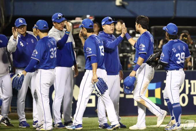 2일 서울 잠실야구장에서 열린 프로야구 2024 신한 SOL Bank KBO리그 삼성 라이온즈와 두산 베어스의 경기, 4대 2로 승리를 거둔 삼성 박진만 감독이 선수들을 격려하고 있다. 2024.5.2/뉴스1 ⓒ News1 이광호 기자