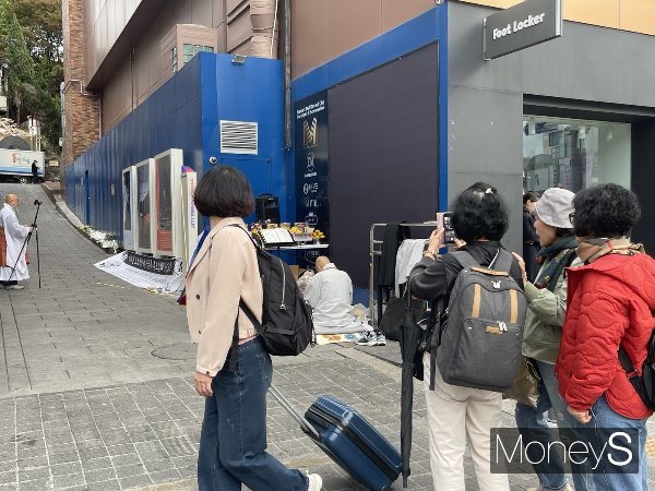 이태원 참사 2주기를 맞은 골목엔 사람이 없다. 사진은 길을 가던 일행이 가던 길을 멈추고 사진을 찍는 모습. /사진=유찬우 기자