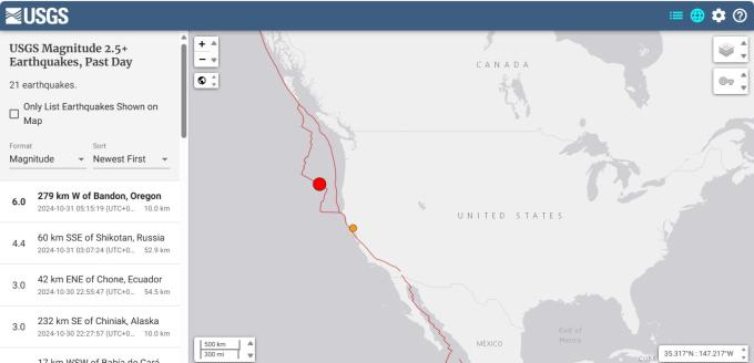 AFP통신에 따르면 USGS는 규모 6.0의 지진이 미 서부 오리건주 밴던 시에서 173마일(279㎞) 떨어진 태평양 아래의 단층선에서 발생했다고 전했다.