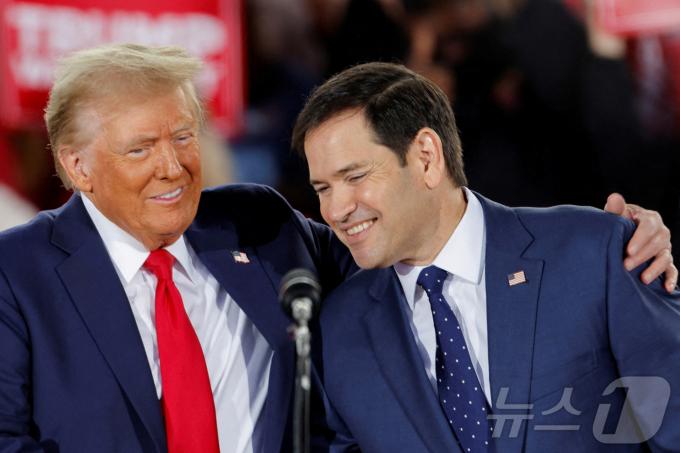 지난 4일(현지시간) 미국 노스캐롤라이나주 롤리에서 열린 선거 유세에서 도널드 트럼프 미국 대통령 당선인과 마르코 루비오 상원의원(플로리다)이 웃고 있다. 24.11.04 ⓒ 로이터=뉴스1 ⓒ News1 김예슬 기자