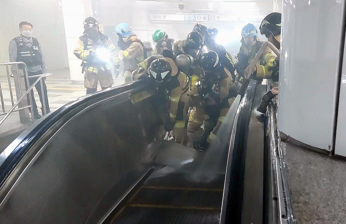 서울지하철 1·4호선 동대문역 에스컬레이터에서 지난 18일 밤 9시40분쯤 불이 났다. 사진은 지난 18일 밤 9시 40분쯤 서울 종로구 지하철 4호선 동대문역 9번 출구 에스컬레이터에서 불이 나 출동한 소방대원들이 화재를 진압하는 모습. /사진=뉴스1(종로소방서 제공)