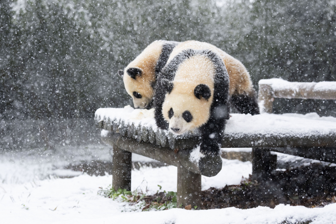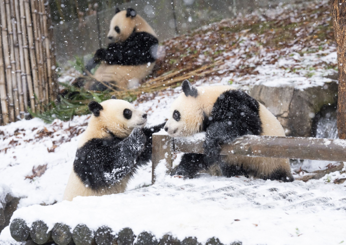하지만 이날 밤사이 많은 눈이 내리자 판다 주키퍼(사육사)들은 루이바오와 후이바오가 난생처음 눈에서 놀 수 있는 시간을 마련했다.