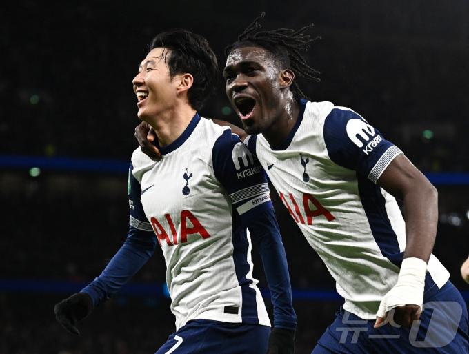 토트넘 홋스퍼 공격수 손흥민(왼쪽)이 20일(한국시간) 열린 2024-25 리그컵 8강 맨체스터 유나이티드전에서 후반 43분 결승 골을 터뜨려 팀의 4-3 승리를 이끌었다. ⓒ 로이터=뉴스1