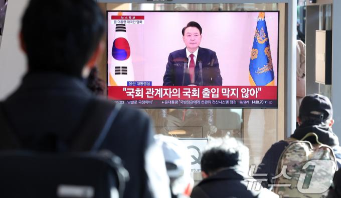 윤석열 대통령에 대한 국회의 탄핵소추안 발의일인 12일 서울 중구 서울역 대합실에서 시민들이 윤석열 대통령의 4번째 대국민 담화를 시청하고 있다. 2024.12.12/뉴스1 ⓒ News1 김성진 기자