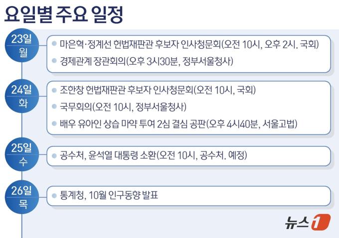 국회는 23일 더불어민주당이 추천한 마은혁·정계선 헌법재판관 후보자 인사청문회를 개최한다. 이튿날인 24일에는 국민의힘이 추천한 조한창 후보자에 대한 인사청문회가 열린다. 더불어민주당은 24일 재판관 후보자 3명에 대한 인사청문경과보고서를 채택한 뒤 27일 국회 본회의를 열고 임명동의안을 처리한다는 계획이다. 이어 대통령실로 동의안을 송부, 한덕수 대통령 권한대행 국무총리의 조속한 임명을 압박할 방침이다. 한 권한대행의 재판관 임명에 반대하고 있는 국민의힘은 인사청문회에 불참한다는 방침이다. 임명동의안이 국회를 통과할 경우 즉시 헌법재판소에 권한쟁의심판을 청구, 대통령 권한대행이 재판관을 임명할 수 있는지 여부를 따져보겠다는 계획이다.