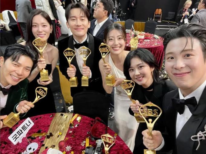 공개된 사진에는 '2024 SBS 연기대상' 시상식에 참석한 드라마 '굿파트너'의 주연 배우 장나라와 남지현, 김준한, 피오, 지승현, 한재이 등이 트로피를 든 채 모여 미소 짓고 있다.
