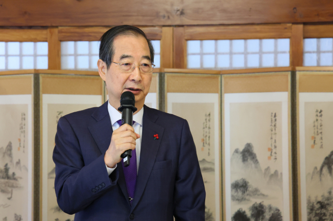 정부가 쌍특검법 등을 오는 24일 국무회의까지 이행하라는 야당의 요구에 수용불가 입장을 밝혔다. 사진은 23일 서울 종로구 국무총리 공관에서 열린 간담회를 진행하는 한덕수 대통령 권한대행 국무총리. /사진=뉴스1
