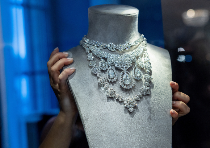 최근 다이아몬드 가격이 급락하면서 중국의 결혼 감소와 경기 둔화가 배경이라는 분석이 나왔다. 사진은 스위스 제네바에 있는 크리스티 경매장에서 한 직원이 다이아몬드 목걸이를 들고 있는 모습. /사진=로이터