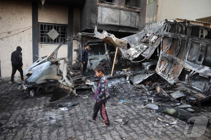 2024년 12월 26일 가자지구 중부의 누세이라트 난민 캠프에서 한 소년이 이스라엘의 공격으로 파괴된 방송 차량 앞을 지나가고 있다. ⓒ AFP=뉴스1