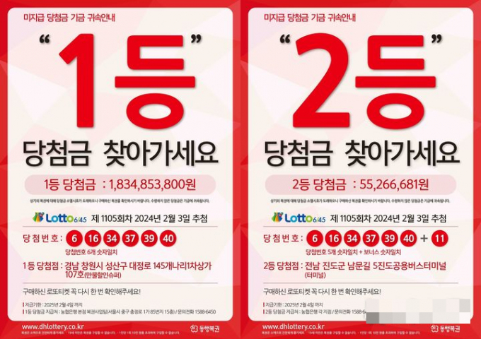 미수령한 1등 당첨금액은 18억3485만3800만원으로 당첨 번호는 '6, 16, 34, 37, 39, 40'이다. 2등 당첨금은 5526만6681원으로 당첨 번호는 '6, 16, 34, 37, 39, 40'과 보너스 번호 '11'이다.